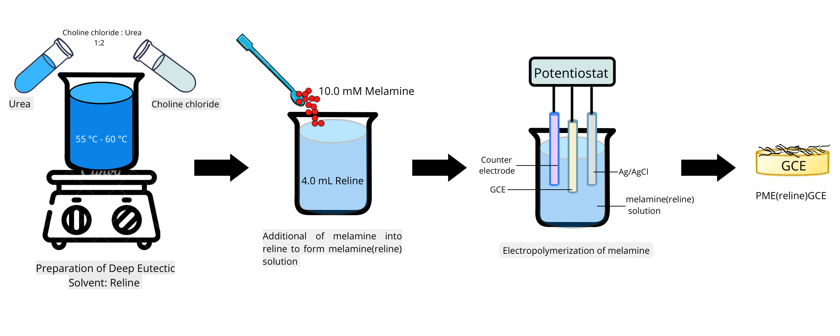 kami melaporkan proses pengoptimum elektropolimerisasi melamin dalam DES-relin.