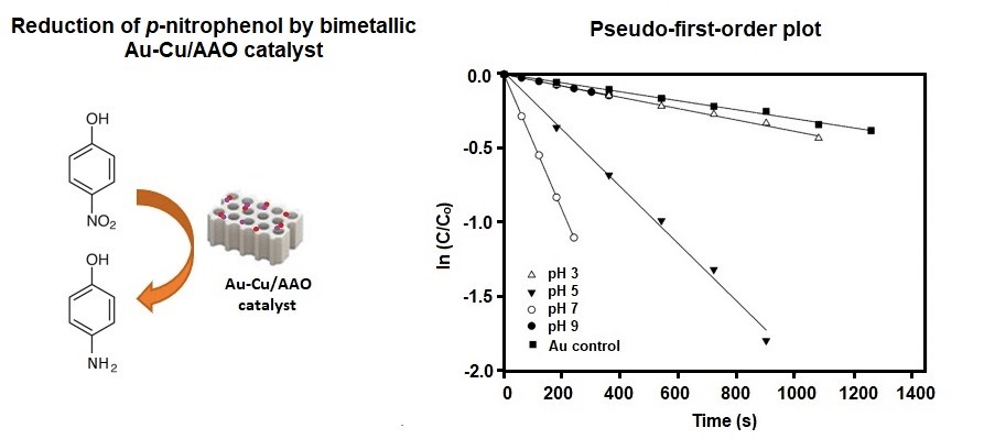 Au–Cu bimetallic catalysts in the reduction of p-nitrophenol (p-NP) were evaluated. Results showed