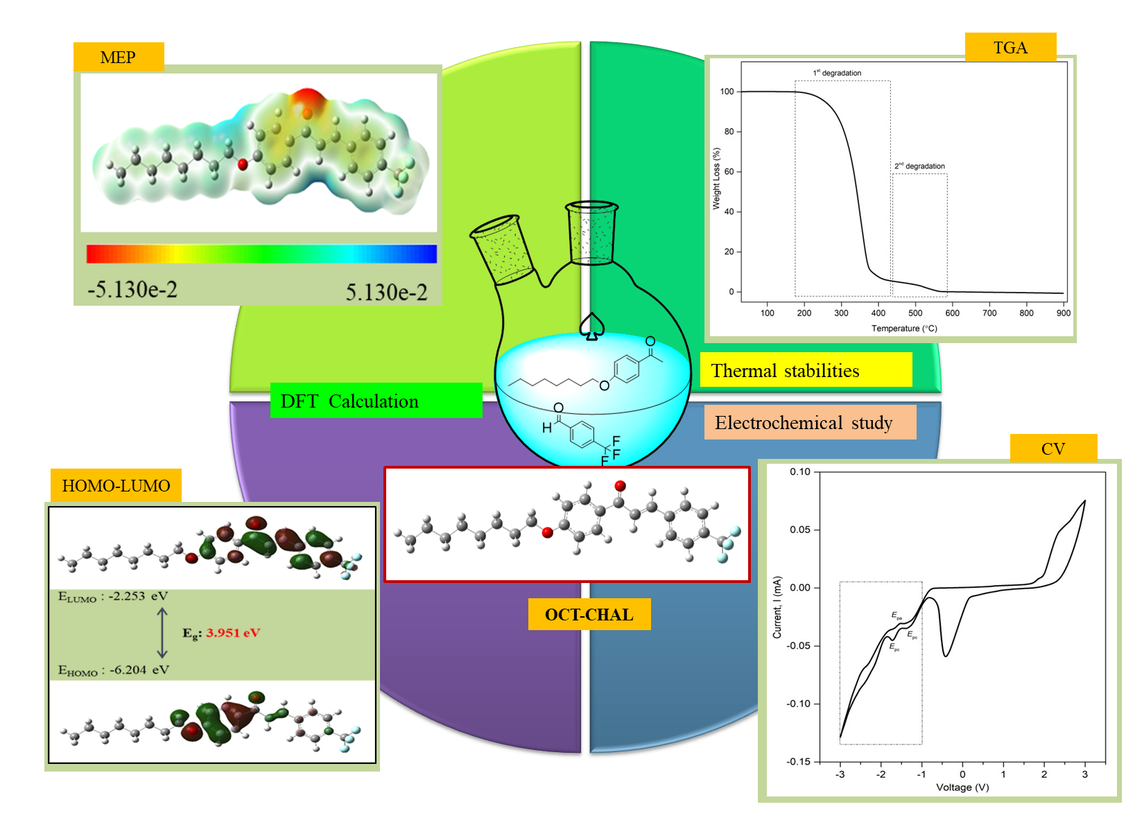 pengiraan DFT bagi sistem yang direkabentuk telah dinilai secara menyeluruh. Alkoksi-kalkon (OCT-CHAL) ini menunjukkan jalur serapan pada lmak 312 nm dengan