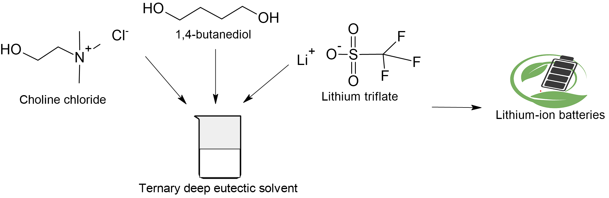 explores the potential of ternary DES, which comprises choline chloride (ChCl), 1,4-butanediol (1,4-BD), and lithium triflate (LiTf), as an electrolyte in lithium-ion batteries. The