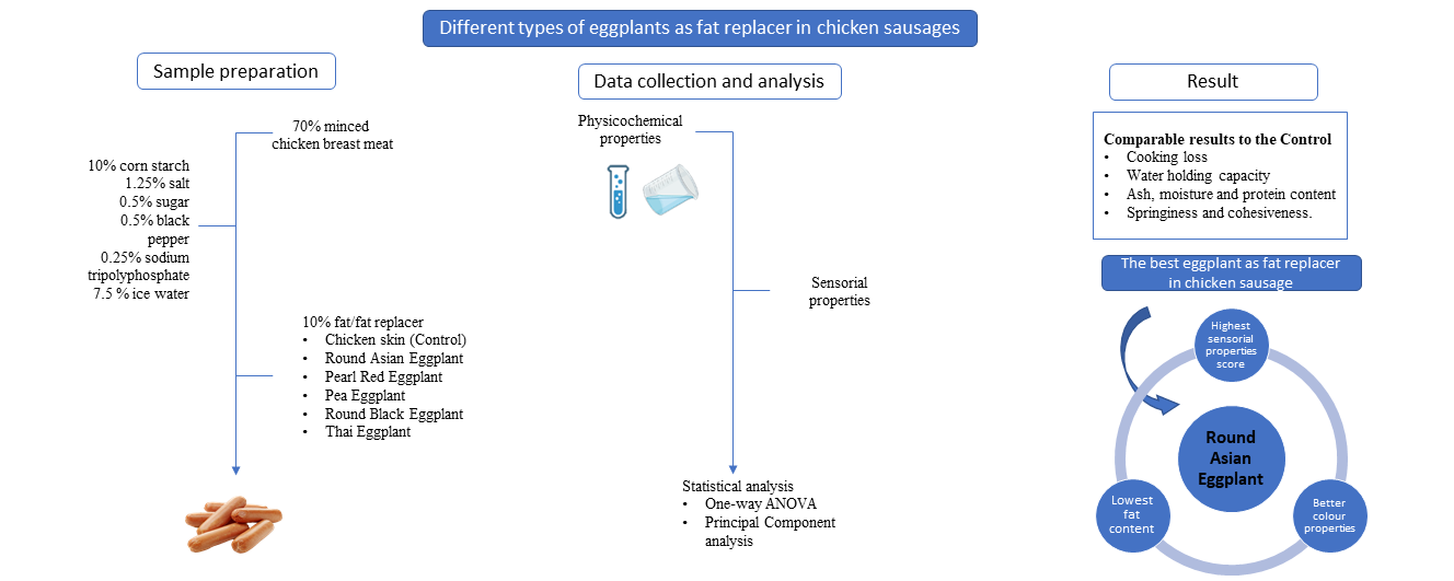 (PE), Round Black Eggplant (RBE), dan Green Thai Eggplant (GTE)] sebagai pengganti lemak. Sosej ayam telah